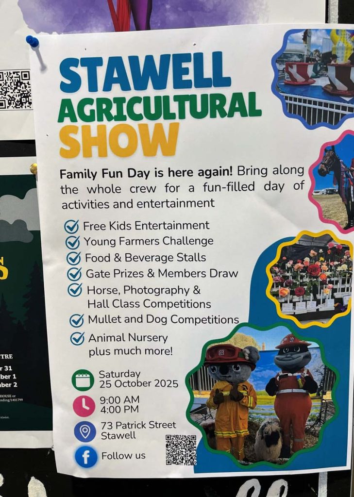 The Stawell Ag show on Saturday was packed with family fun with free activities all day throughout the showgrounds, including Animal nursery, Puppet show, cartoon portraits etc. Horse events that included horsemanship challenge, photography comp, dog show, shearing demonstration, scare crow com plus lots more. The weather held out and there was a light sprinkle of rain towards the end of the day.