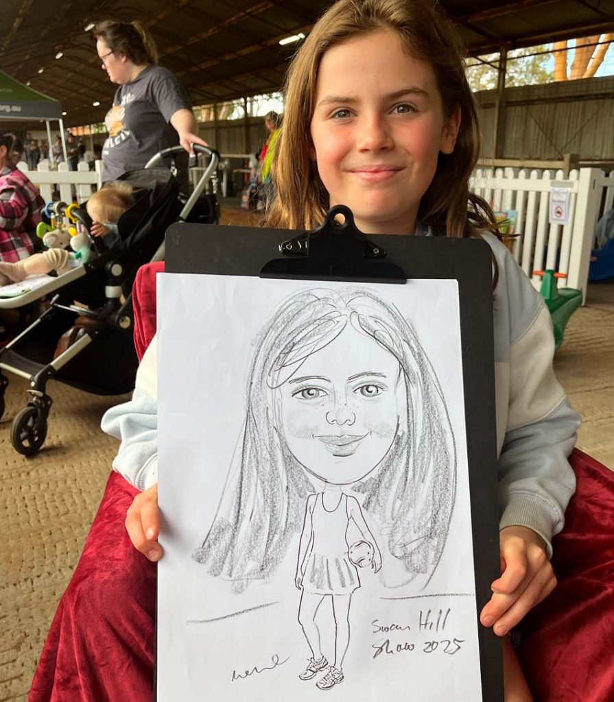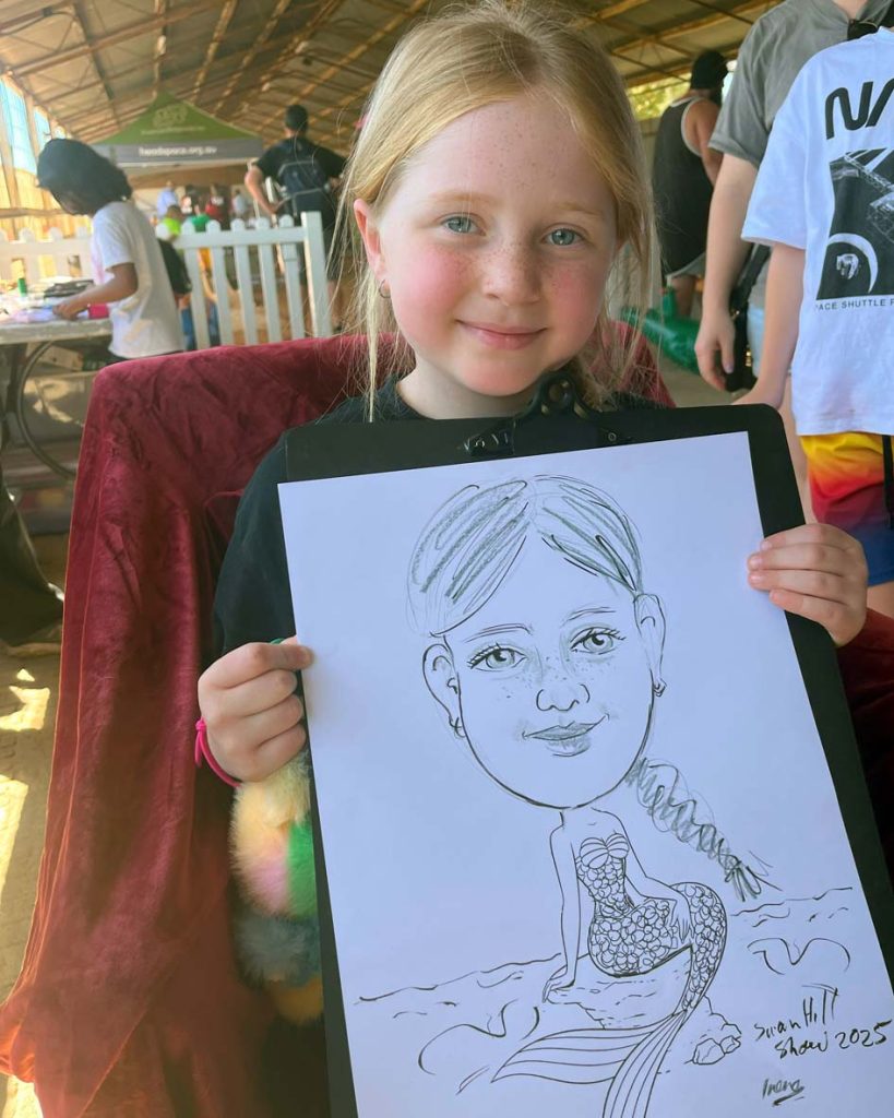 Traveling from South coast NSW to Swan Hill via Gundagai was beautiful especially seeing the green hills this time of the year. Although a lot of people mentioned the dams were low and they needed follow-up rain. The Swan Hill 2 day show was packed full of country show features including rides and a Kids Zone where children and adults enjoyed their cartoon portraits to take home, a keepsake of the show day. The weather was a bit wild and it was a great to be located out of the winds and especially on Saturday a hot day. View advertising as follows: https://www.swanhillshow.com.au/events , https://theguardian.com.au/news/2025/10/04/free-kids-space-at-show/ , https://www.instagram.com/p/DOqN2DrimZE/ ,
